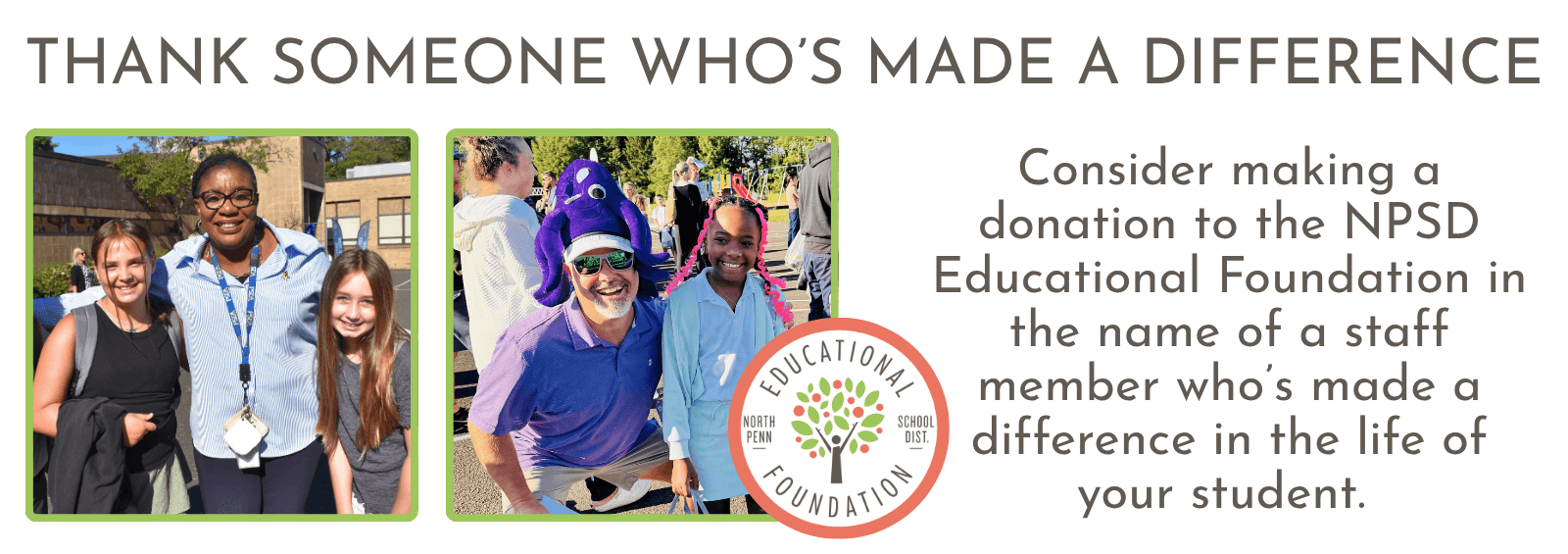 By making a gift to the NPSD Educational Foundation in the name of a special staff member, you are supporting our mission to motivate and inspire North Penn students and staff through innovative projects and opportunities that enhance educational experiences and resources. The staff member(s) that you choose to honor will receive a card informing them of your kindness and a certificate to display in their classroom or office. Your gift is tax-deductible and will be recognized by the Foundation.